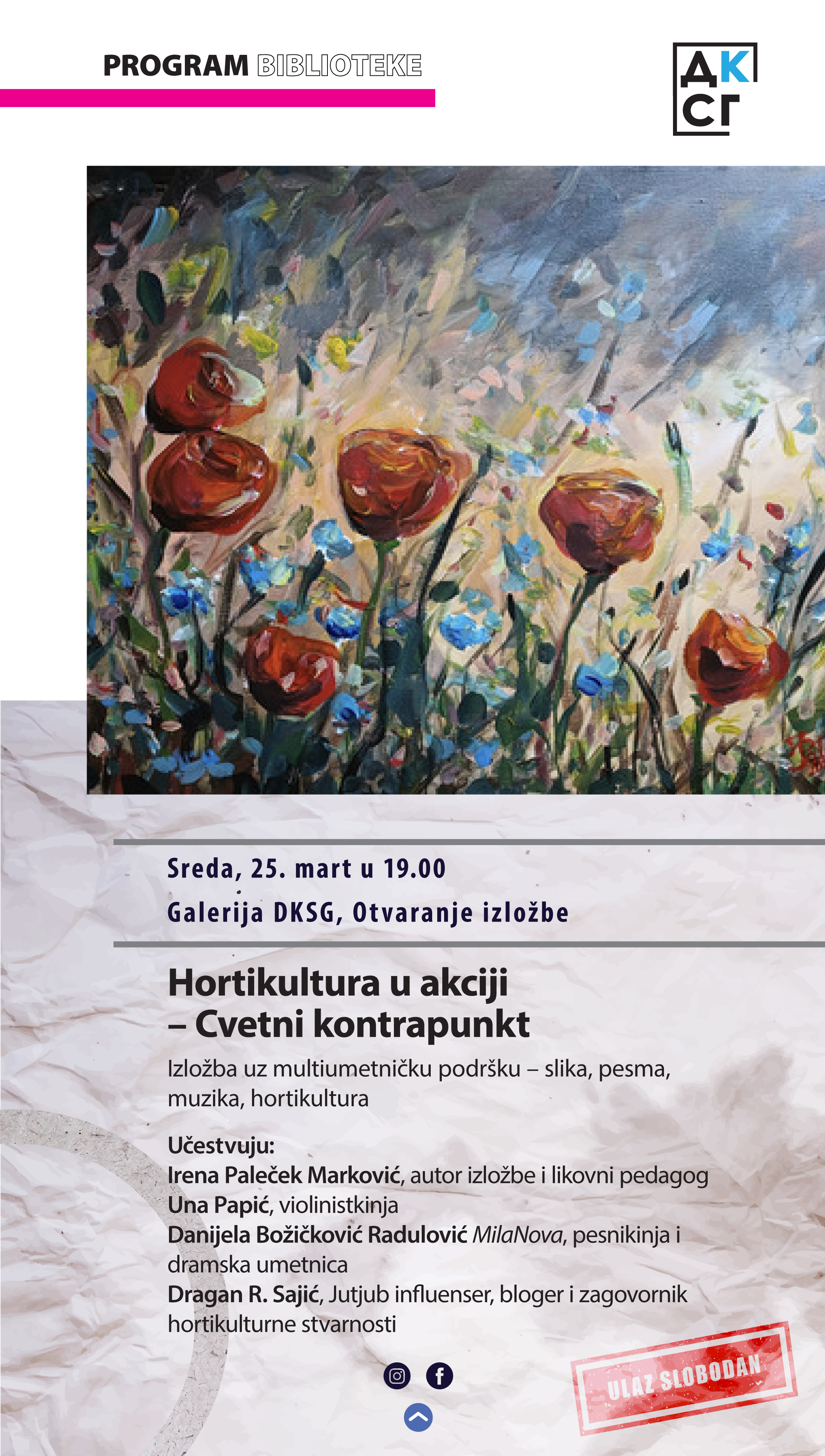 Зароните у свет у којем биљке причају своје приче ! У Холу Библиотеке Дома културе "Студентски град" Нови Београд, од 3. до 31. марта,2026. године јединствена изложба књига коју су припремиле Верица Лукић и Кристина Угреновић.